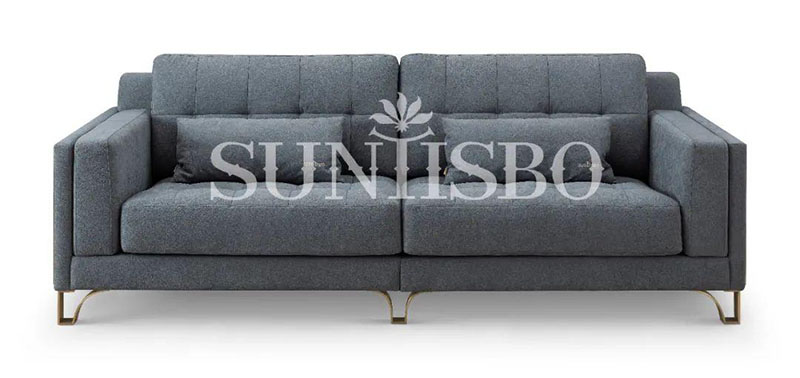 沙發(fā)采用細(xì)膩的顆粒感皮料,不僅增加了霧霾藍(lán)色彩的飽和度,也在視覺上充實(shí)了空間的安全感。輪廓,扶手皆為干練利落的直線,放眼望去不僅簡化了空間,也傳達(dá)著對精簡生活的追求。