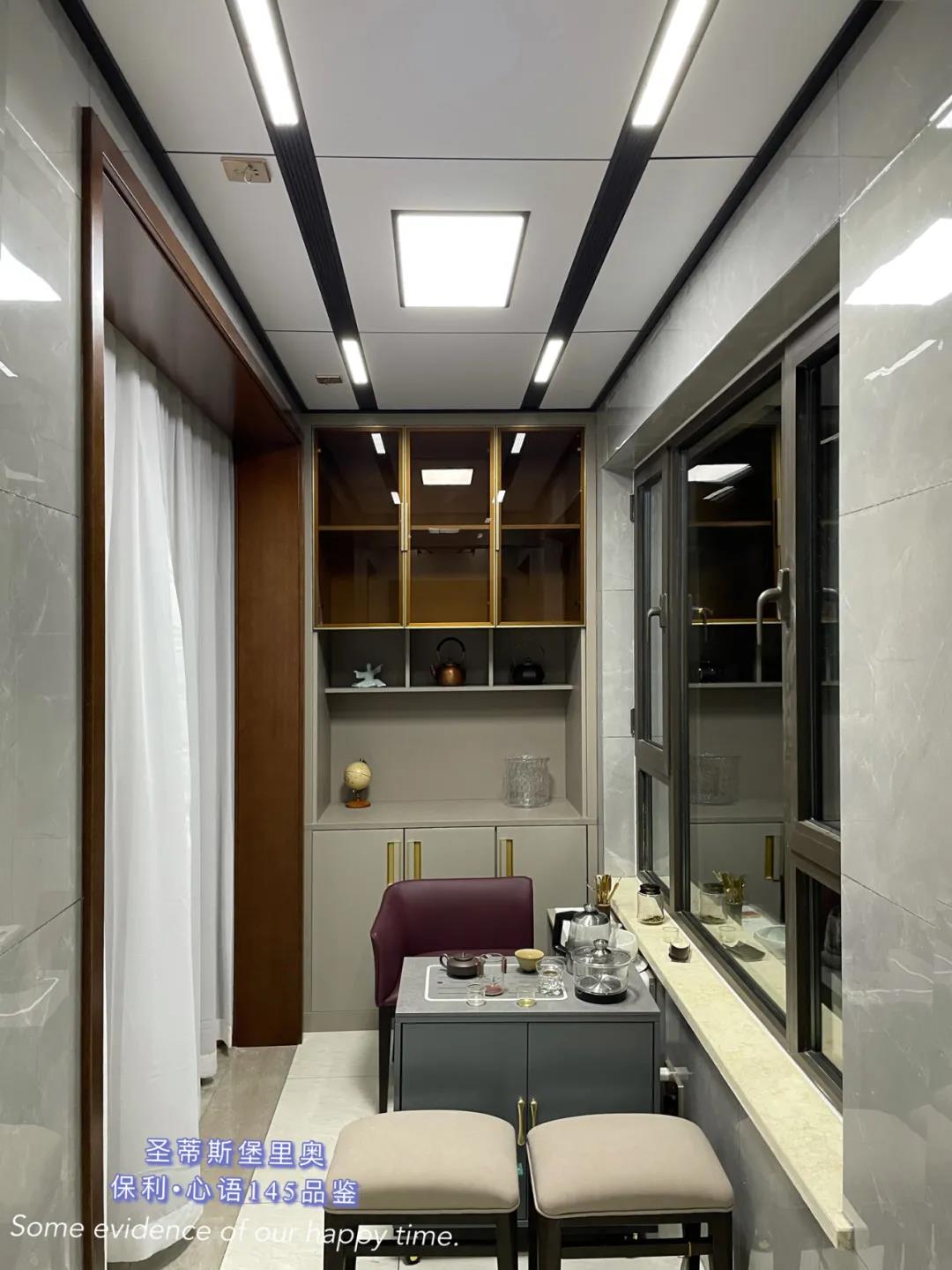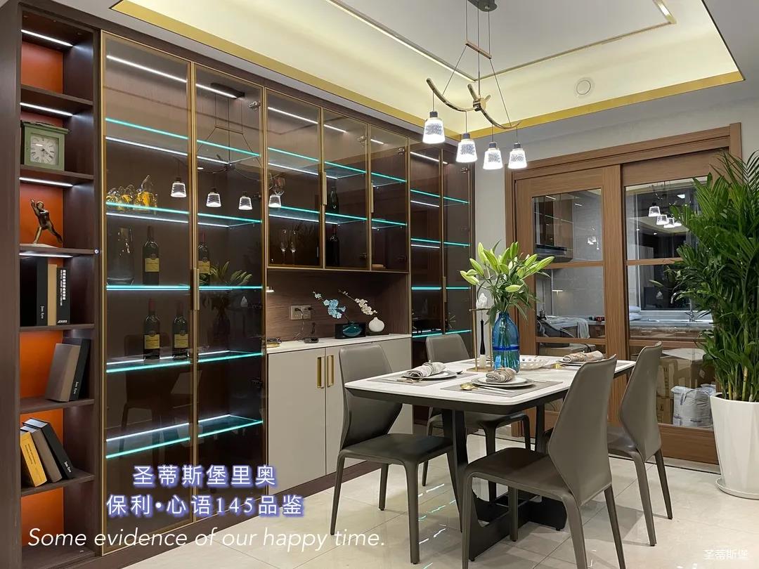 ▲餐廳一面及頂?shù)耐该鞴耋w,以簡(jiǎn)練的金屬線條分割出收納空間,讓立面視覺更顯精致干凈。餐邊柜設(shè)置了臺(tái)面、全玻璃展示區(qū)以及隱藏收納區(qū),滿足了日常生活中多樣的收納需求。