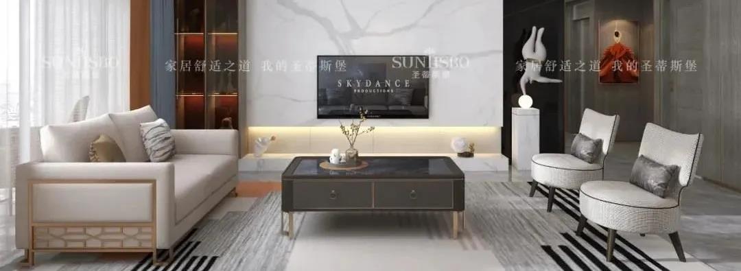 ▲客廳以灰色為主調(diào),電視背景墻采用拼接大理石搭配實(shí)木闌珊,與對(duì)立墻面形成撞色處理,既可以加深空間層次感,也提升了空間明亮度。一字型真皮沙發(fā)與實(shí)木電視柜中和了大空間的空曠,打造出一個(gè)談心敘話的和諧空間。