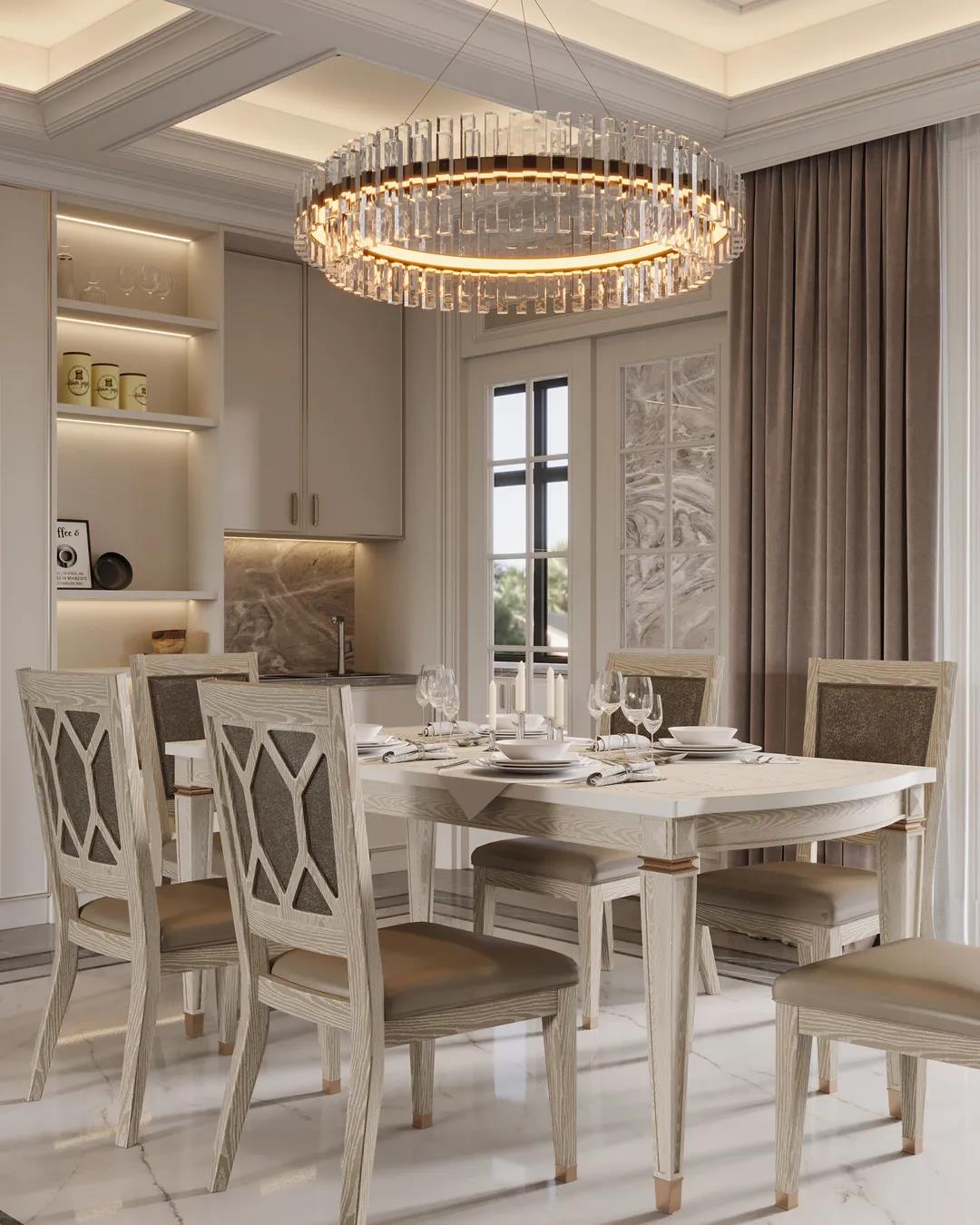 在華麗而精致的餐廳中,仿古白的餐桌椅搭配通透的水晶高腳杯,兩者交相輝映,用餐儀式感十足。墻面的護(hù)墻板和酒柜呈現(xiàn)一字型設(shè)計(jì),一方面增添空間整體的豐盈感,還強(qiáng)調(diào)出個(gè)性現(xiàn)代的輕奢布局。